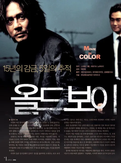 《올드보이》(2003)는 박찬욱 감독의 대표작으로, 영화의 주인공인 오대수(최민식)가 감금된 15년을 마친 후 복수를 위해 펼치는 이야기를 다룬다. 이 영화는 단순한 복수극을 넘어서, 인간의 심리와 사회적 이슈를 다루며 지금까지도 회자되는 강렬한 반전과 명장면을 선보인다.